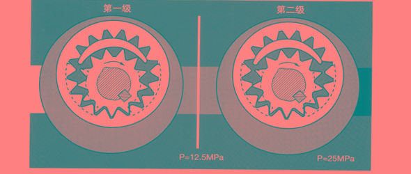 第一級(jí)齒輪付進(jìn)口壓力OMPa,出口壓力12.5MPa;第二級(jí)進(jìn)口壓力12.5MPa, 出口壓力25MPa。當(dāng)出口壓力為25MPa時(shí),每級(jí)齒輪付僅承擔(dān)12.5MPa壓力差,改善了泵的工作條件,延長(zhǎng)了泵的使用壽命.